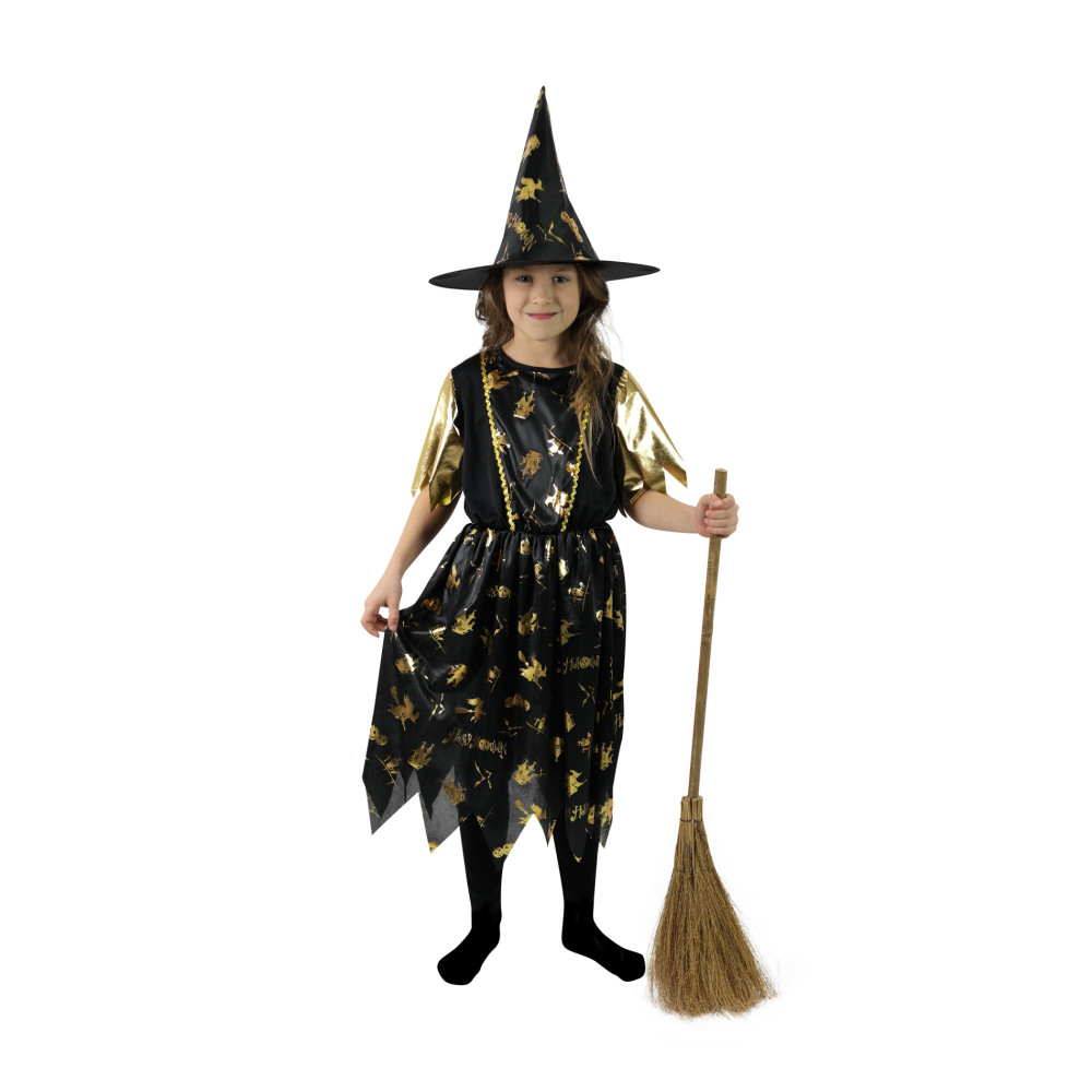 Halloweensky kostým pre malé čarodejnice! Kostým čierno-zlatej farby vo veľkosti M je určený pre dievčatká vo vekovom rozmedzí 6-8 rokov (117-128 cm). Šaty sú dekorované zlatými halloweenskymi motívmi. Súčasťou kostýmu je perfektne zladený čarodejnícky klobúk. S týmto úchvatným kostýmom sa zaručene staneš hviezdou karnevalu aj Halloweenu! Nielen tento rok je potrebné myslieť EKO-nomicky aj EKO-logicky! EKO-balenie je vhodné najmä pre e-shopy, kde zákazník nakupuje podľa fotografie a nie je potrebné veľké balenie s vešiakom. EKO-logicky - na balenie bolo použitých menej plastu a ďalších materiálov. Jedná sa o malý transparentný obal s fotografiou. EKO-obaly - EKO-obal zaberie len polovicu miesta - šetrite skladové miesta s nami!