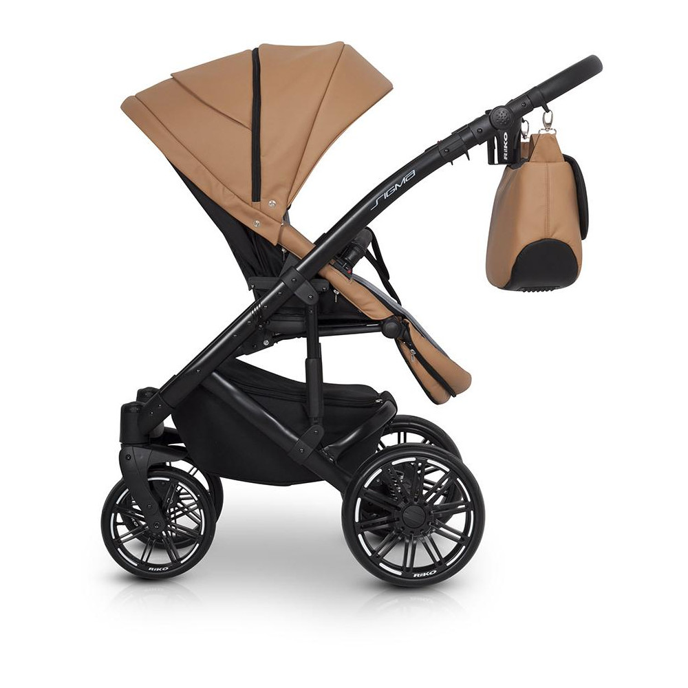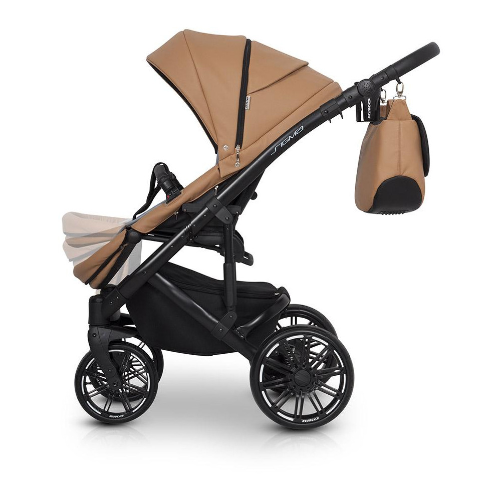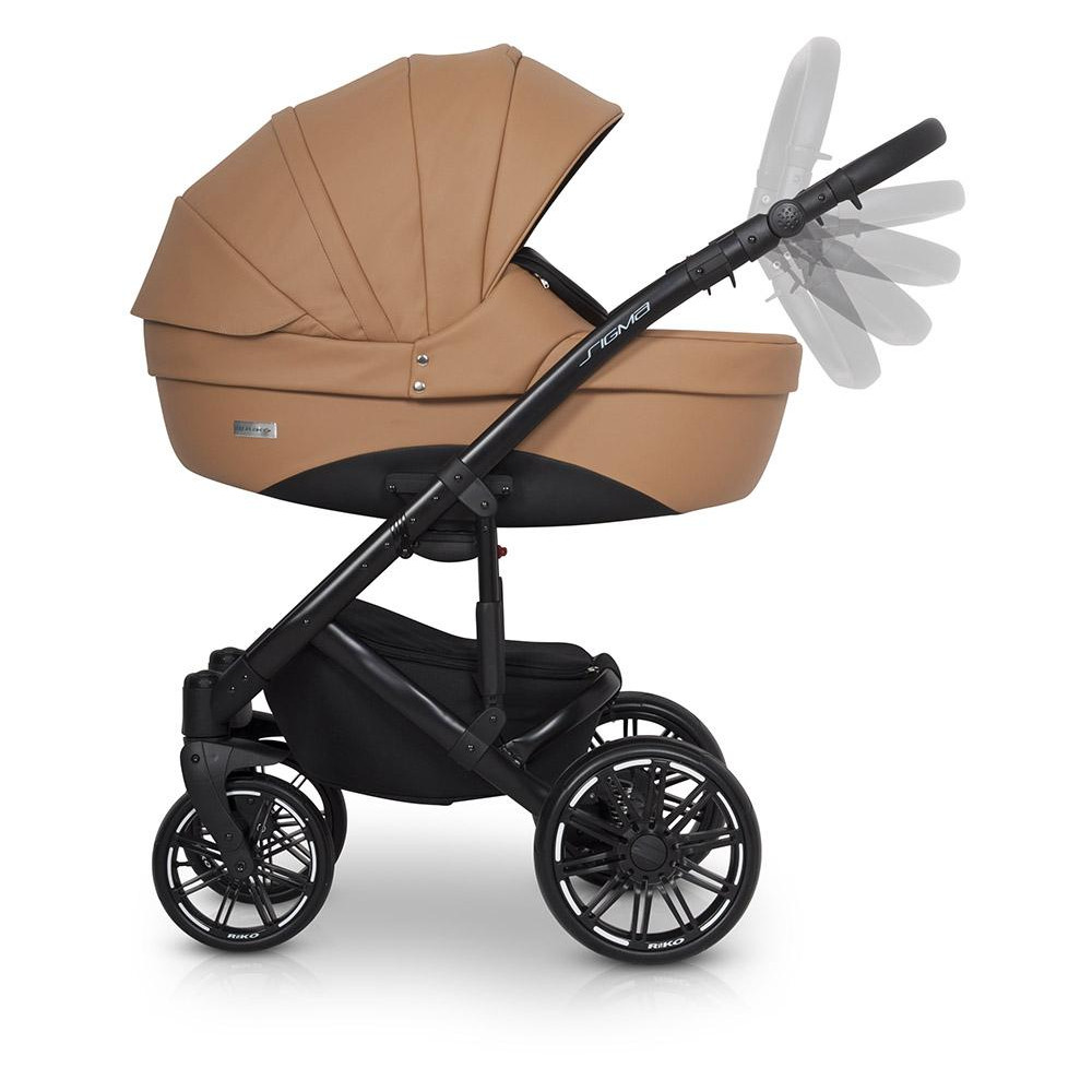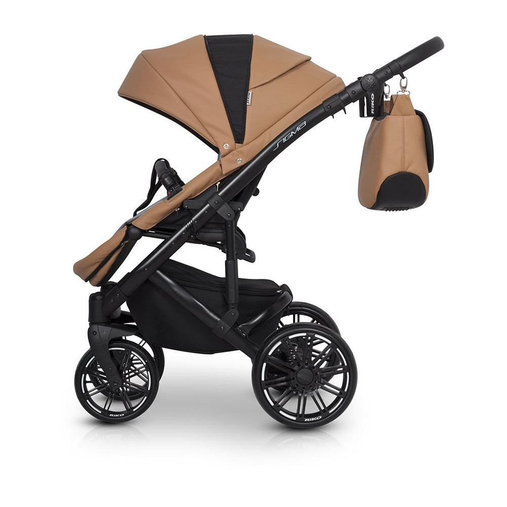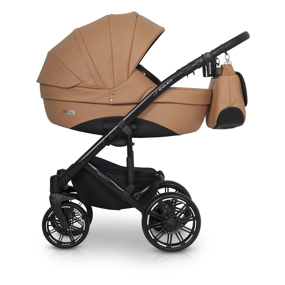 Wózek dziecięcy Riko Sigma Caramel Wózek SIGMA marki RIKO został zaprojektowany w oparciu o Państwa sugestie. Model ten wyróżnia się nowym typem siedziska spacerowego, które posiada dużo wyższe oparcie niż nasze starsze modele i jest niżej osadzone, co ułatwia dziecku dostęp. Dodatkowo SIGMA posiada praktyczny stopnień, dzięki któremu Twojemu dziecku będzie łatwiej wsiadać do wózka, gdy będzie już nieco starsze. Siedzisko posiada nowoczesny i wygodny wytłaczany materacyk wykonany z przyjaznej dla skóry dzianiny. Na szczególna uwagę zasługują również nowej generacji koła bezdętkowe z oponami wykonanymi z poliuretanu. Zapewniają taką samą amortyzację jak koła pompowane, ale są od nich dużo lżejsze, odporniejsze na ścieranie i różnice temperatur, a brak dętki sprawia, że są praktycznie niezniszczalne. Nasze nowe koła zostały wyprodukowane na nasze zlecenie przez producenta z branży Automotive. Charakterystyka nowoczesny wózek wielofunkcyjny z możliwością montażu fotelika samochodowego grupy 0+ Kite ISOFIX Ready, lekki aluminiowy stelaż, duża wygodna gondola z materacykiem i regulacją oparcia, zewnętrzna regulacja oparcia w gondoli, siedzisko w wersji spacerowej z możliwością montażu przodem i tyłem do kierunku jazdy, regulacja podnóżka, 4-stopniowa regulacja oparcia siedziska łącznie z pozycją leżącą, dodatkowy materacyk na siedzisku wykonany z miękkiej dzianiny, wielostopniowa regulacja budki siedziska wraz z dodatkową sekcją pozwalającą pochylić budkę do przodu, pokrowiec na nóżki dziecka, 5-punktowe pasy bezpieczeństwa, dodatkowy pas krokowy mocowany do barierki bezpieczeństwa, barierka bezpieczeństwa z możliwością odchylenia na bok, podnóżek i barierka obszyte praktyczną skórą ekologiczną, prowadnica wózka obszyta praktyczną skórą ekologiczną, regulacja wysokości prowadnicy, duży kosz na zakupy z praktycznym przykryciem, łatwy dostęp do kosza na zakupy, duża praktyczna torba mocowana na prowadnicy wózka, pokrowiec przeciwdeszczowy pasujący zarówno do gondoli jak i do siedziska, moskitiera do gondoli, przewijak, uchwyt na butelkę, dodatkowa amortyzacja gondoli i siedziska z regulacją twardości, innowacyjne łożyskowane koła z oponami z poliuretanu, system amortyzacji przednich koł ASS (Anti Shock System), system regulacji twardości zawieszenia HDA (Heavy Duty Absorption), system szybkiego demontażu przednich kół QRS (Quick Release System), przednie koła samonastawne z możliwością blokady do jazdy prosto, centralny hamulec postojowy. Dane techniczne Rozłożony stelaż z kołami: 103 x 61 x 105 cm Złożony stelaż z kołami: 83 x 61 x 40 cm Zakres regulacji rączki (od ziemi): 72-115 cm Wewnętrzny wymiar gondoli: 22 x 80 x 37 cm Szerokość siedziska: 31 cm Wysokość oparcia: 49 cm Głębokość siedziska: 25 cm Długość podnóżka: 23 cm Średnica kół (tył/przód): 24 / 29 cm Waga stelaż z kołami: 10,00 kg Gondola: 5,40 kg Siedzisko: 6,70 kg Fotelik samochodowy: 4,00 kg