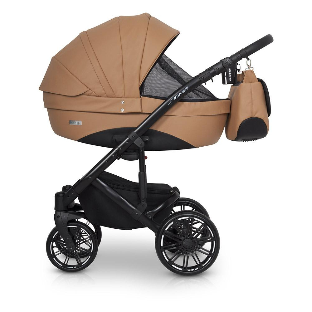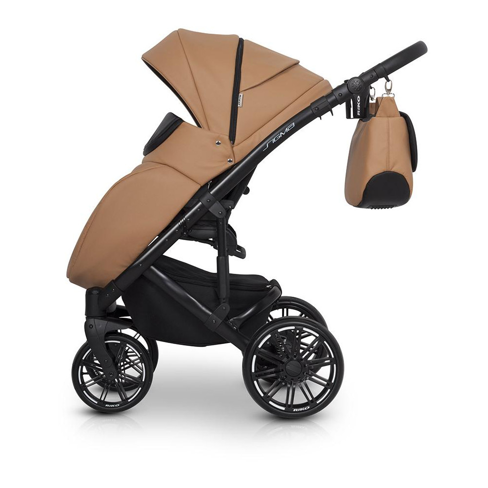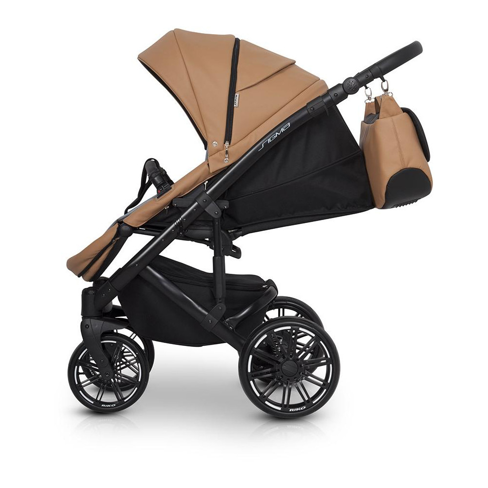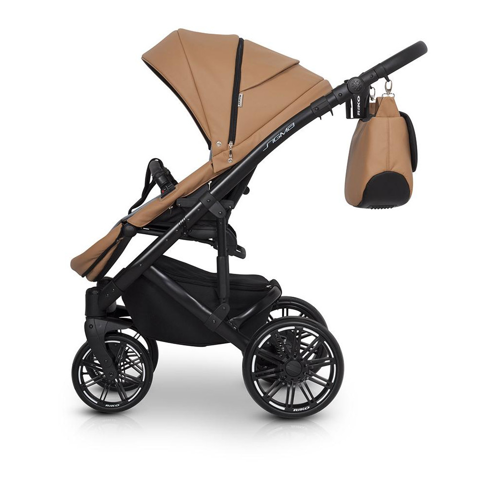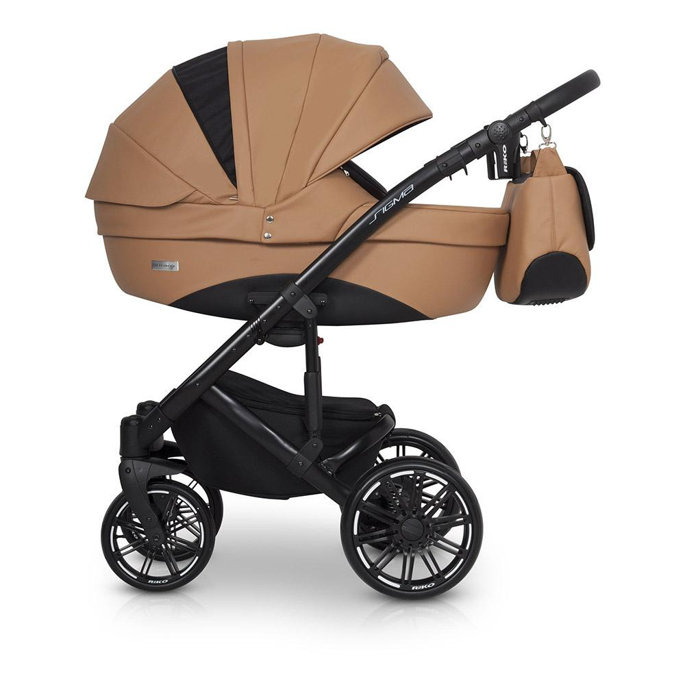 Wózek dziecięcy Riko Sigma Caramel Wózek SIGMA marki RIKO został zaprojektowany w oparciu o Państwa sugestie. Model ten wyróżnia się nowym typem siedziska spacerowego, które posiada dużo wyższe oparcie niż nasze starsze modele i jest niżej osadzone, co ułatwia dziecku dostęp. Dodatkowo SIGMA posiada praktyczny stopnień, dzięki któremu Twojemu dziecku będzie łatwiej wsiadać do wózka, gdy będzie już nieco starsze. Siedzisko posiada nowoczesny i wygodny wytłaczany materacyk wykonany z przyjaznej dla skóry dzianiny. Na szczególna uwagę zasługują również nowej generacji koła bezdętkowe z oponami wykonanymi z poliuretanu. Zapewniają taką samą amortyzację jak koła pompowane, ale są od nich dużo lżejsze, odporniejsze na ścieranie i różnice temperatur, a brak dętki sprawia, że są praktycznie niezniszczalne. Nasze nowe koła zostały wyprodukowane na nasze zlecenie przez producenta z branży Automotive. Charakterystyka nowoczesny wózek wielofunkcyjny z możliwością montażu fotelika samochodowego grupy 0+ Kite ISOFIX Ready, lekki aluminiowy stelaż, duża wygodna gondola z materacykiem i regulacją oparcia, zewnętrzna regulacja oparcia w gondoli, siedzisko w wersji spacerowej z możliwością montażu przodem i tyłem do kierunku jazdy, regulacja podnóżka, 4-stopniowa regulacja oparcia siedziska łącznie z pozycją leżącą, dodatkowy materacyk na siedzisku wykonany z miękkiej dzianiny, wielostopniowa regulacja budki siedziska wraz z dodatkową sekcją pozwalającą pochylić budkę do przodu, pokrowiec na nóżki dziecka, 5-punktowe pasy bezpieczeństwa, dodatkowy pas krokowy mocowany do barierki bezpieczeństwa, barierka bezpieczeństwa z możliwością odchylenia na bok, podnóżek i barierka obszyte praktyczną skórą ekologiczną, prowadnica wózka obszyta praktyczną skórą ekologiczną, regulacja wysokości prowadnicy, duży kosz na zakupy z praktycznym przykryciem, łatwy dostęp do kosza na zakupy, duża praktyczna torba mocowana na prowadnicy wózka, pokrowiec przeciwdeszczowy pasujący zarówno do gondoli jak i do siedziska, moskitiera do gondoli, przewijak, uchwyt na butelkę, dodatkowa amortyzacja gondoli i siedziska z regulacją twardości, innowacyjne łożyskowane koła z oponami z poliuretanu, system amortyzacji przednich koł ASS (Anti Shock System), system regulacji twardości zawieszenia HDA (Heavy Duty Absorption), system szybkiego demontażu przednich kół QRS (Quick Release System), przednie koła samonastawne z możliwością blokady do jazdy prosto, centralny hamulec postojowy. Dane techniczne Rozłożony stelaż z kołami: 103 x 61 x 105 cm Złożony stelaż z kołami: 83 x 61 x 40 cm Zakres regulacji rączki (od ziemi): 72-115 cm Wewnętrzny wymiar gondoli: 22 x 80 x 37 cm Szerokość siedziska: 31 cm Wysokość oparcia: 49 cm Głębokość siedziska: 25 cm Długość podnóżka: 23 cm Średnica kół (tył/przód): 24 / 29 cm Waga stelaż z kołami: 10,00 kg Gondola: 5,40 kg Siedzisko: 6,70 kg Fotelik samochodowy: 4,00 kg