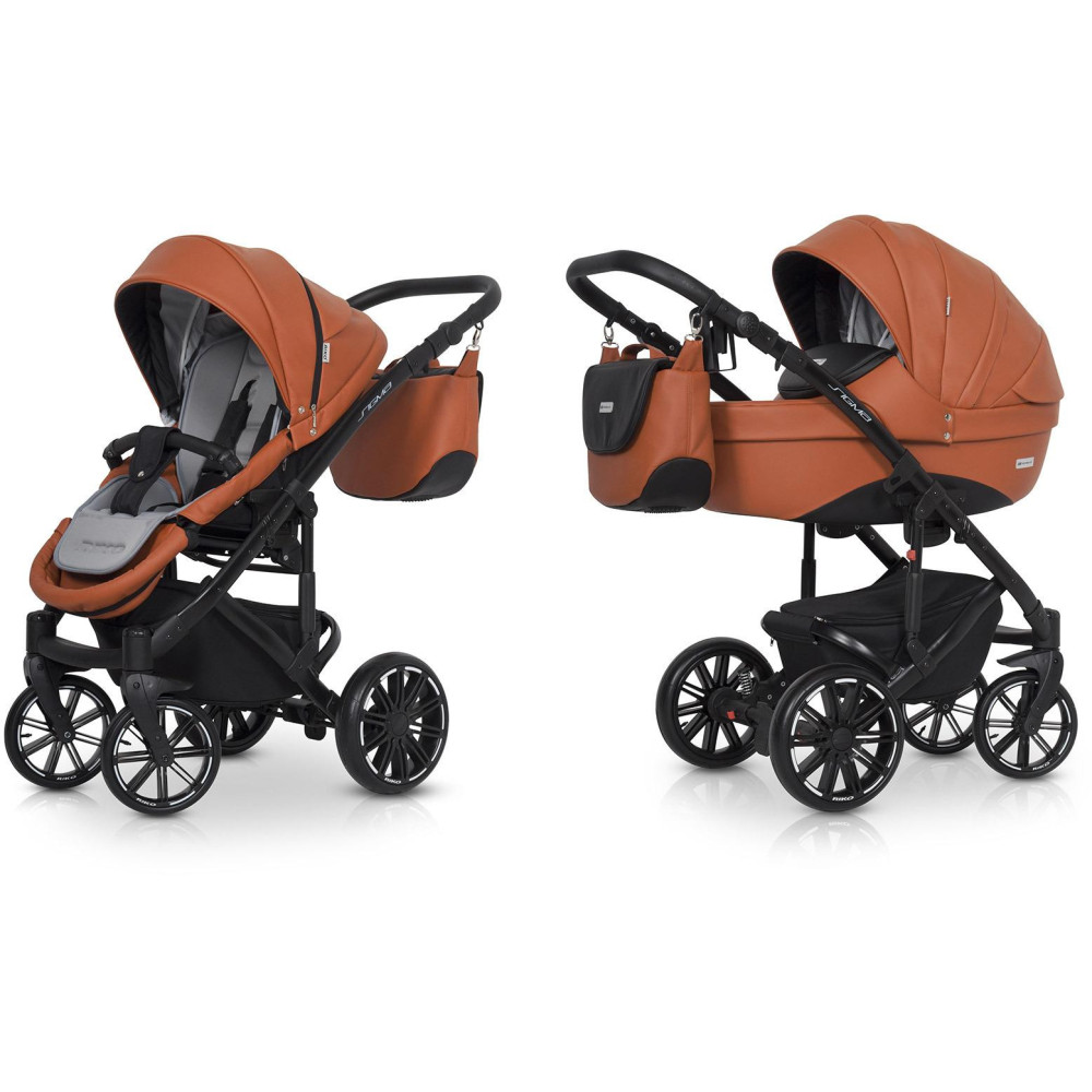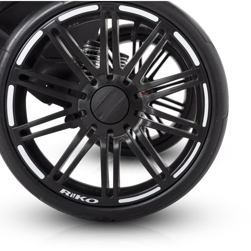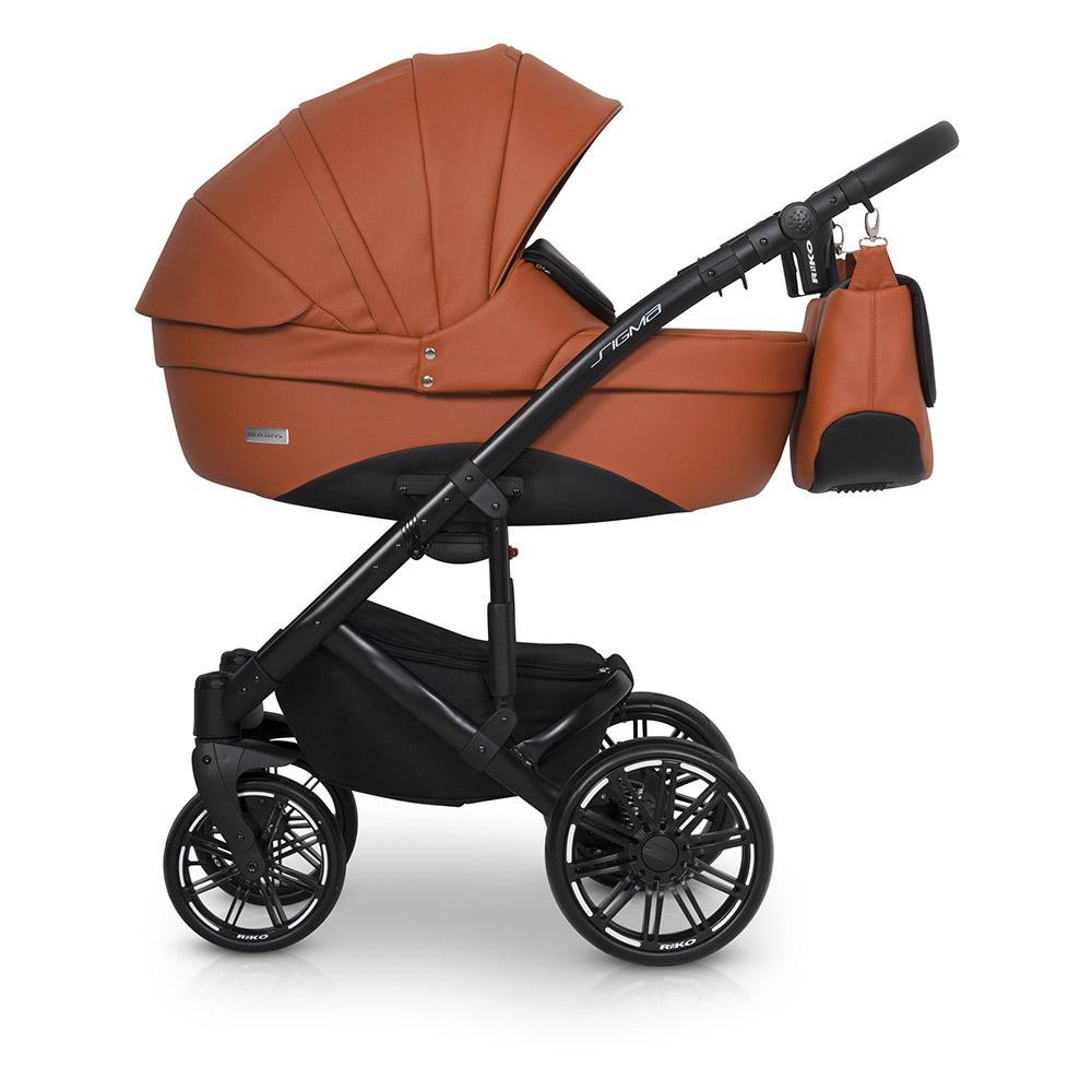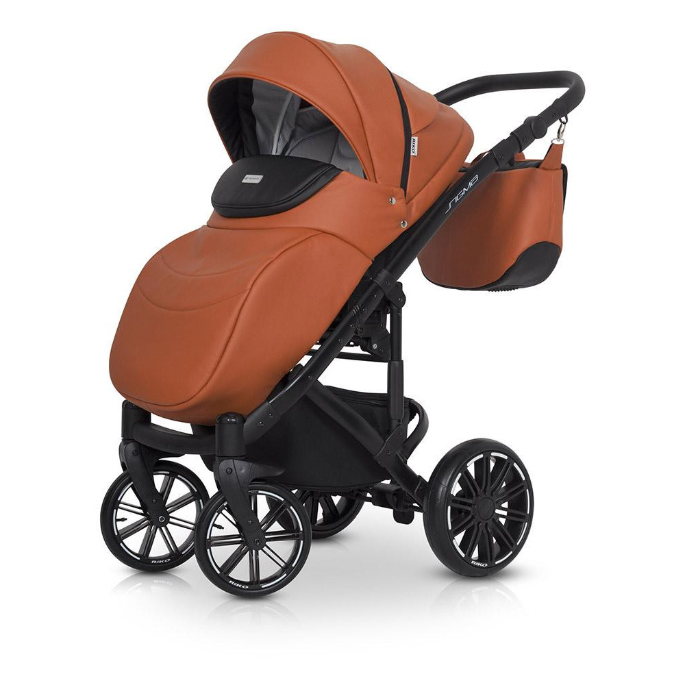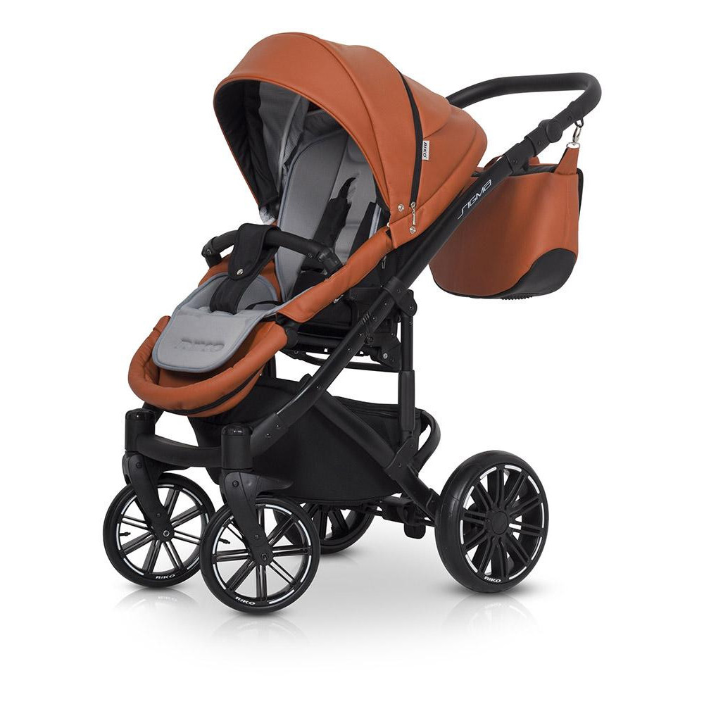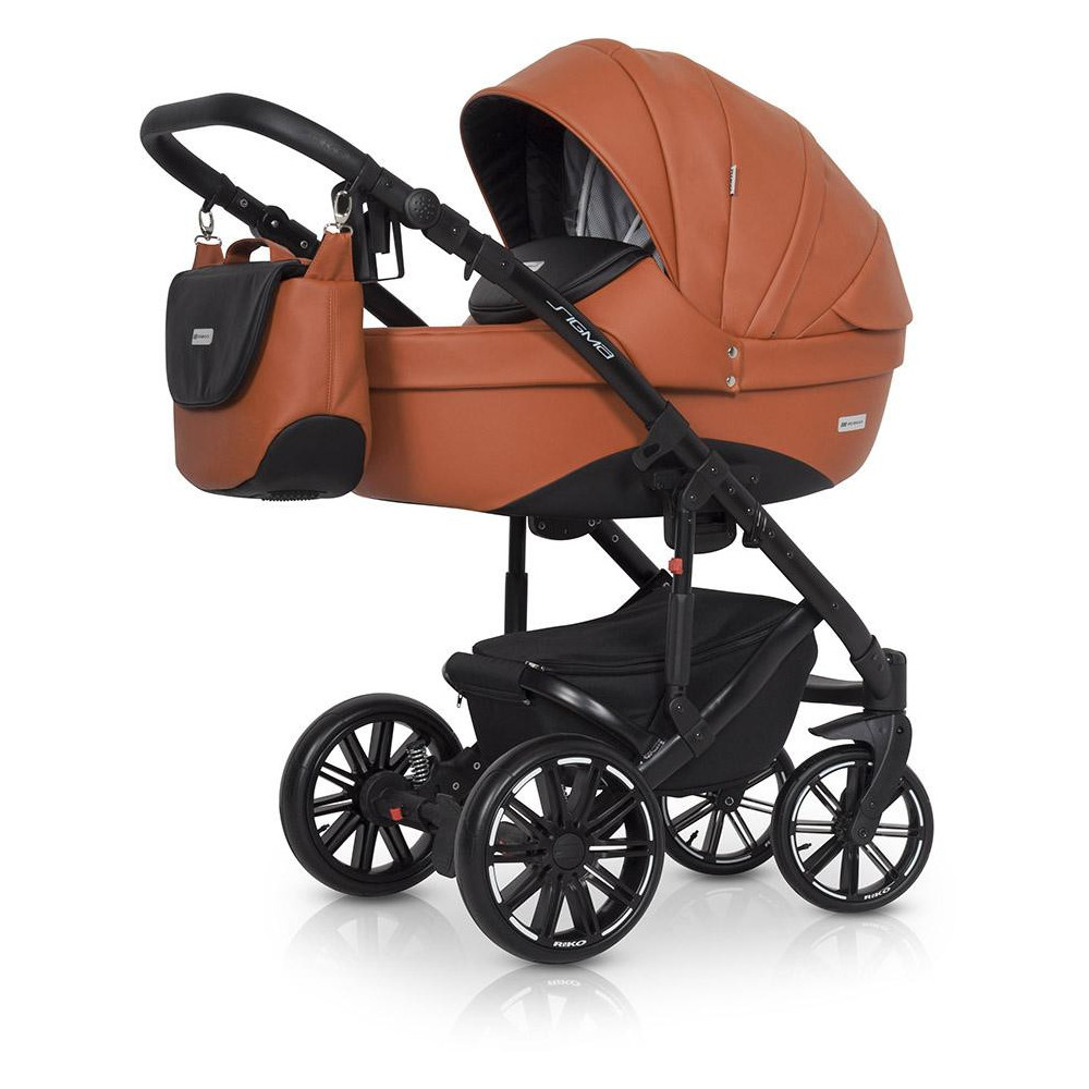 Wózek dziecięcy Riko Sigma Cognac Wózek SIGMA marki RIKO został zaprojektowany w oparciu o Państwa sugestie. Model ten wyróżnia się nowym typem siedziska spacerowego, które posiada dużo wyższe oparcie niż nasze starsze modele i jest niżej osadzone, co ułatwia dziecku dostęp. Dodatkowo SIGMA posiada praktyczny stopnień, dzięki któremu Twojemu dziecku będzie łatwiej wsiadać do wózka, gdy będzie już nieco starsze. Siedzisko posiada nowoczesny i wygodny wytłaczany materacyk wykonany z przyjaznej dla skóry dzianiny. Na szczególna uwagę zasługują również nowej generacji koła bezdętkowe z oponami wykonanymi z poliuretanu. Zapewniają taką samą amortyzację jak koła pompowane, ale są od nich dużo lżejsze, odporniejsze na ścieranie i różnice temperatur, a brak dętki sprawia, że są praktycznie niezniszczalne. Nasze nowe koła zostały wyprodukowane na nasze zlecenie przez producenta z branży Automotive. Charakterystyka nowoczesny wózek wielofunkcyjny z możliwością montażu fotelika samochodowego grupy 0+ Kite ISOFIX Ready, lekki aluminiowy stelaż, duża wygodna gondola z materacykiem i regulacją oparcia, zewnętrzna regulacja oparcia w gondoli, siedzisko w wersji spacerowej z możliwością montażu przodem i tyłem do kierunku jazdy, regulacja podnóżka, 4-stopniowa regulacja oparcia siedziska łącznie z pozycją leżącą, dodatkowy materacyk na siedzisku wykonany z miękkiej dzianiny, wielostopniowa regulacja budki siedziska wraz z dodatkową sekcją pozwalającą pochylić budkę do przodu, pokrowiec na nóżki dziecka, 5-punktowe pasy bezpieczeństwa, dodatkowy pas krokowy mocowany do barierki bezpieczeństwa, barierka bezpieczeństwa z możliwością odchylenia na bok, podnóżek i barierka obszyte praktyczną skórą ekologiczną, prowadnica wózka obszyta praktyczną skórą ekologiczną, regulacja wysokości prowadnicy, duży kosz na zakupy z praktycznym przykryciem, łatwy dostęp do kosza na zakupy, duża praktyczna torba mocowana na prowadnicy wózka, pokrowiec przeciwdeszczowy pasujący zarówno do gondoli jak i do siedziska, moskitiera do gondoli, przewijak, uchwyt na butelkę, dodatkowa amortyzacja gondoli i siedziska z regulacją twardości, innowacyjne łożyskowane koła z oponami z poliuretanu, system amortyzacji przednich koł ASS (Anti Shock System), system regulacji twardości zawieszenia HDA (Heavy Duty Absorption), system szybkiego demontażu przednich kół QRS (Quick Release System), przednie koła samonastawne z możliwością blokady do jazdy prosto, centralny hamulec postojowy. Dane techniczne Rozłożony stelaż z kołami: 103 x 61 x 105 cm Złożony stelaż z kołami: 83 x 61 x 40 cm Zakres regulacji rączki (od ziemi): 72-115 cm Wewnętrzny wymiar gondoli: 22 x 80 x 37 cm Szerokość siedziska: 31 cm Wysokość oparcia: 49 cm Głębokość siedziska: 25 cm Długość podnóżka: 23 cm Średnica kół (tył/przód): 24 / 29 cm Waga stelaż z kołami: 10,00 kg Gondola: 5,40 kg Siedzisko: 6,70 kg Fotelik samochodowy: 4,00 kg